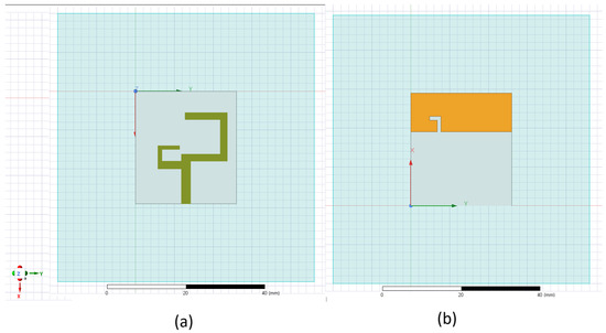 Table 1 summarizes the antenna’s physical dimensions defined in Figure 2. The exact size of the board, location, and dimensions of traces define the precise performance of the entire antenna. This will be identified in different scenarios, as explained in the next section. Figure 3a,b show the design.