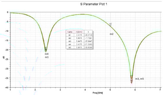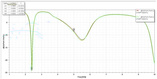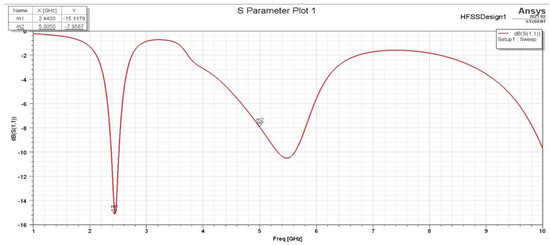It has been noticed that these two changes in the L slot are acceptable in terms of the achieved performance. On the other hand, it was found that the changing position of the L slot on the Y-axis and the length of the L slot along the X-axis affect the S11 plots and gain. The S11 for the second assumption is more selective for the aim frequencies. Also, the frequencies have slightly shifted to the lower-frequency side, which indicates the required frequencies (2.4 GHz and 5 GHz). With a frequency sweep from 1 GHz to 10 GHz, it is clear that the antenna S11 parameter shown in Figure 4 is more than that shown in Figure 5, with a wider bandwidth for both frequencies, 2.4 GHz and 5 GHz.