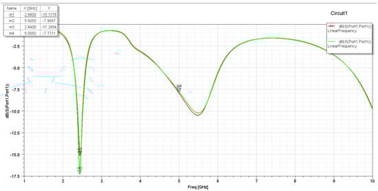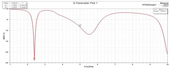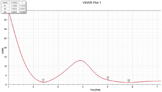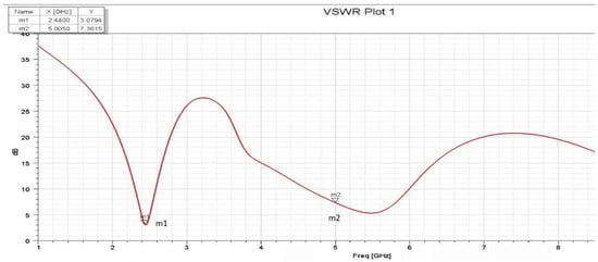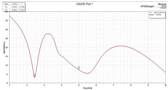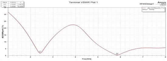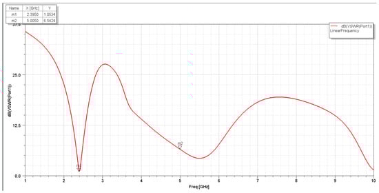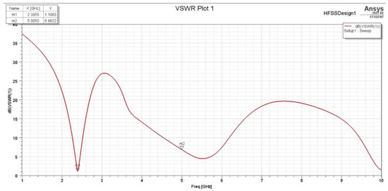 The minor changes in the S11 and VSWR values are due to the Smith Chart showing near-real impedance even without applying an impedance-matching circuit. This proves that the design of the antenna is optimized to not only be tuned to around 2.4 and 5 GHz, but also to perfectly match the 50 Ω cable impedance to be connected to its SMA adapter, which means that there is low net reactance, and, hence, the resistance is almost 50 Ω. Figure 25 and Figure 26 show the S11 and VSWR for the F-shaped antenna after matching the network, respectively. It is noted that the value of S11 in dBs for the matched antenna at 2.4 GHz is almost the same. The VSWR after and before impedance matching is almost identical at certain frequencies.