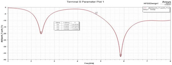 The effectiveness of the chosen antenna can be determined by several factors, including how well it reflects the signal to the transmitter (return loss), how much of the signal is concentrated in a particular direction (gain), and the standing wave ratio (VSWR). Here, to visualize the dips in the S11 dB plot, the frequency sweep was configured from 1 GHz to 8 GHz. As is evident in Figure 11, the antenna appears to be well matched at frequencies 2.42 GHz and 5.85 GHz, with exceptionally minimal signal reflection due to its low return loss.