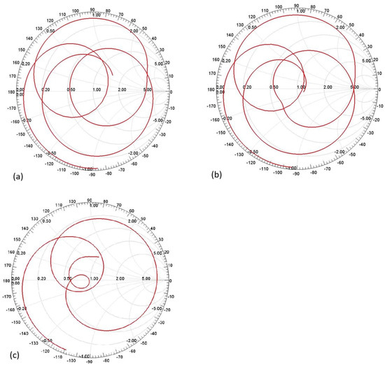 Figure 17a shows the Smith Chart for the first assumption of two C-shaped antennas. Similarly, Figure 17b shows the Smith Chart for the second assumption of the two C-shaped antennas, and Figure 17c shows the Smith Chart for the F-shaped antenna.
