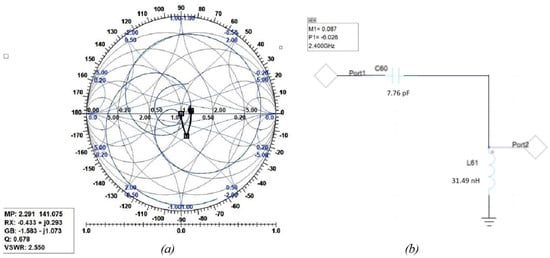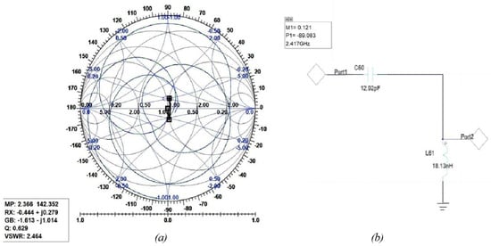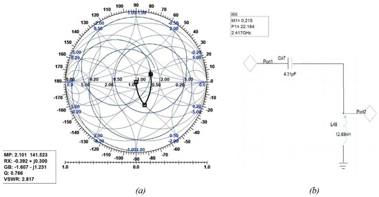 The following figures show the graphical implementation of impedance matching by the Smith tool and its equivalent LC circuit with values of components toward 2.4 GHz where the trace was found. Figure 18 shows the Smith tool (a) and circuit (b) for the first assumption of the two-C-shape antenna. Figure 19 shows the Smith tool (a) and circuit (b) for the second assumption of the two-C-shape antenna. Finally, Figure 20 shows the F-shaped antenna’s Smith and impedance-matching circuit.
