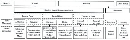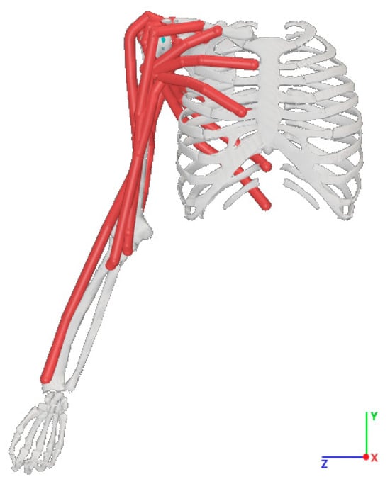 This study’s model is based on Saul et al.’s research in OpenSim and includes the shoulder, elbow, wrist, and hand joints and muscles, simplified for this study (Figure 4).