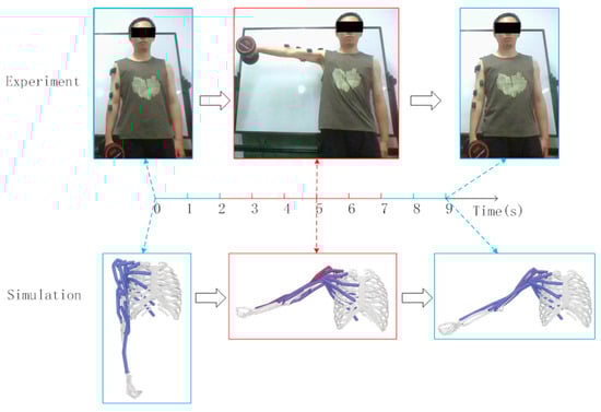 The simulation integrates dynamic equations from the initial state using a 5th-order Runge–Kutta–Fehlberg integrator to calculate muscle activation and contraction velocities. This activation is based on abduction and adduction movements with a 5 kg dumbbell, starting from an upright position and moving to 90 degrees. The experimental and simulation conditions are shown in Figure 5 and Figure 6.