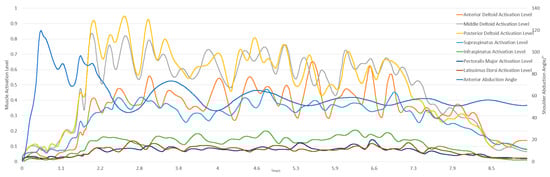 The simplified musculoskeletal model (Figure 3) consists of three bones—the scapula, humerus, and forearm—and eleven muscles, simulating shoulder and elbow joint functions. It allows for adduction, abduction, flexion, extension, rotation, and elbow flexion and extension.