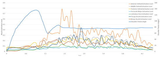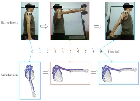The subject held a 5 kg dumbbell, starting from an upright position for 2 s, flexing to 90 degrees for 5 s, and returning to the upright position for another 2 s, totaling 9 s. The model’s initial position in OpenSim matched the experiment, with shoulder elevation, elbow flexion at 0°, and shoulder rotation at 90°. Figure 7 and Figure 8 illustrate the experimental and simulation movements, joint angles, and muscle activation outputs.