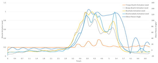 The subject held a 5 kg dumbbell, starting upright for 3 s and then flexing the forearm to 130° for 2 s before returning to the upright position for another 2 s, totaling 7 s. In OpenSim, the initial position matched the experiment, with shoulder elevation at 10° and elbow flexion at 0°. Figure 9 and Figure 10 show the experimental and simulation movements, including joint angles and muscle activation outputs.