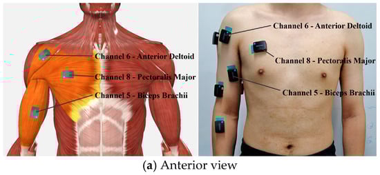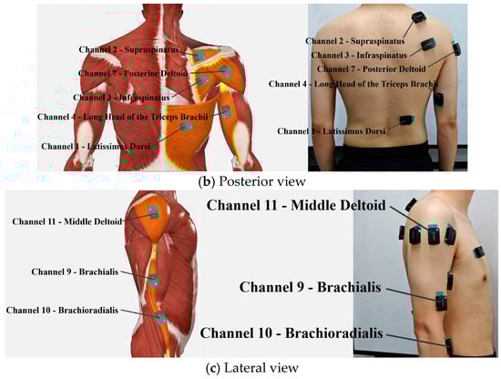 This study used Delsys® Trigno sEMG sensors(Delsys Inc., Massachusetts, USA), transmitting data wirelessly to a base station at a sampling frequency of 2000 Hz. The base station connects to a PC for real-time data processing. In the preprocessing and noise reduction of sEMG signals, sensor placement was optimized, wireless RF technology was used to reduce motion artifacts, a 4th-order Butterworth band-pass filter (20 Hz to 450 Hz) was applied to remove noise, and a notch filter was used to eliminate 50 Hz power line interference. Finally, rectification and envelope processing were performed to extract clear electromyographic signals. This study primarily focuses on the movement of the shoulder and elbow joints of the upper limb. Based on anatomical knowledge, the muscle functions related to the shoulder and elbow joint movements, and the measurability of sEMG signals, the main muscles responsible for driving the movement of these two joints were selected for signal collection. Muscles such as the extensor digitorum, extensor carpi radialis brevis, and palmaris longus muscle were excluded. This study focuses on shoulder and elbow movements, selecting eleven key muscles for data collection: latissimus dorsi, supraspinatus, infraspinatus, triceps brachii, biceps brachii, anterior deltoid, posterior deltoid, pectoralis major, brachialis, brachioradialis, and middle deltoid. The sensor placement is shown in Figure 11.