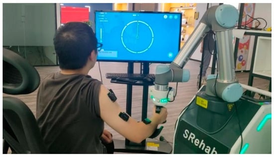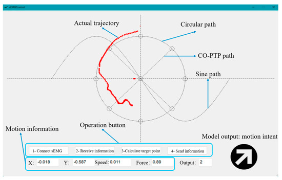 First, data collection for the isometric contraction experiment was conducted. After placing the sensors, as shown in Figure 11, subjects sat about 0.3 m in front of the robot, with their right hand grasping the end effector and forearm resting on the support plate. They then performed movements prompted by the interface (Figure 12). The robot restricted movement to a horizontal area of 0.6 m × 0.3 m and applied a maximum resistance of 25 N against the movement. Subjects were instructed to move smoothly to simulate isotonic contraction.