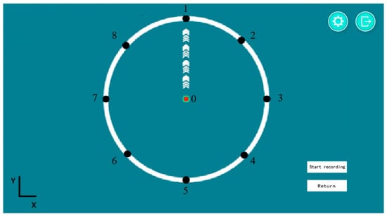 The position of the robot’s end effector was indicated on the screen as a red circular cursor (Figure 13). Movements started at the center point (0) and followed directional cues to black circular points (1–8) arranged clockwise. Returning from point (8) to the center completed one set. Each subject performed five sets, with 1–2 min of rest between sets. During each set, the end effector’s position coordinates (x, y) and six-dimensional force measurements (Fx, Fy) were recorded at 60 Hz, while sEMG data were collected at 2000 Hz. Raw data were accessible via the data analysis interface.