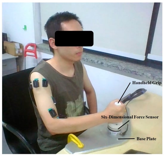 Next, data collection for the isometric contraction experiment was conducted. Figure 14 shows the equipment and setup for collecting isometric contraction data. The hardware system mainly consists of a handheld grip, a six-dimensional force sensor, and a base plate, among other components.