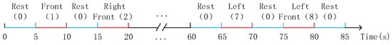 During data collection, subjects placed the sensors, as shown in Figure 11, and sat in front of a table, approximately 0.2 m from the grip. They performed isometric contractions in eight directions (coded 1 to 8), with rest intervals (coded 0) in between. Each movement sequence followed a predefined pattern (Figure 15 and Figure 16) and lasted 85 s, with rest and contraction phases at 5 s each. Seven subjects completed five sets of actions at force levels of 5 N, 10 N, 15 N, 20 N, and 25 N, resting for 1 min between sets.