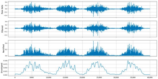 During sEMG signal collection, various noise sources can negatively impact signal quality. Optimizing sensor placement is essential to reduce crosstalk from ECG and unrelated muscle activity. Additionally, wireless data transmission can minimize motion artifacts caused by cables. While these measures improve signal quality, further filtering is necessary to extract reliable sEMG signals. The most valuable information is found between 20 Hz and 500 Hz, so band-pass filtering is applied. This study uses a fourth-order Butterworth filter from 20 Hz to 450 Hz and a notch filter to eliminate 50 Hz power line interference [23,24,25]. Processed sEMG signals undergo rectification and envelope detection to assess muscle activation [26]. Figure 17 shows the raw sEMG data, band-pass filtered data, rectified data, and the envelope.