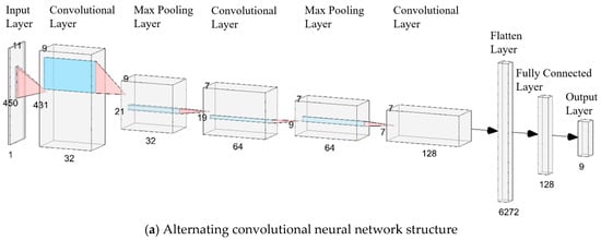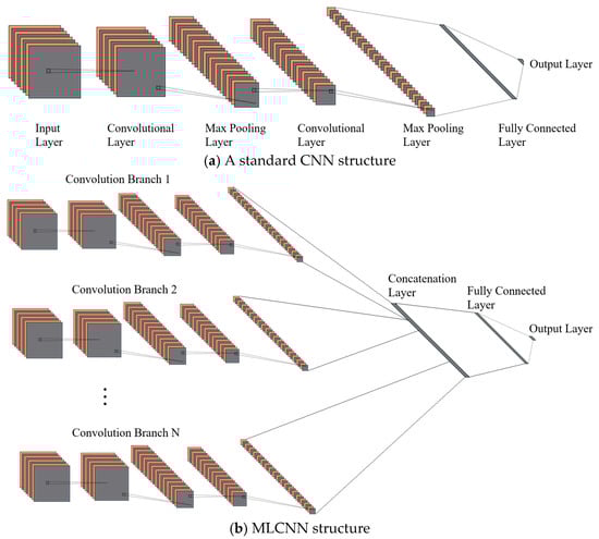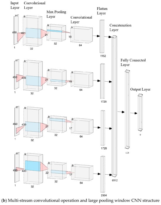 Based on the deep learning framework Keras in Python, an alternating convolutional CNN and MLCNN are constructed, as shown in Figure 19a,b, respectively [27]. The numbers in the figures represent the dimensions of each tensor.