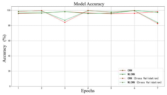The results of the seven training sessions and cross-validation are shown in Figure 21. Among the models obtained from the seven training sessions, the average accuracy of the CNN model is 96.62%, with an average accuracy of 94.44% on the cross-validation set. The average accuracy of the MLCNN model is 97.13%, with an average accuracy of 95.04% on the cross-validation set.