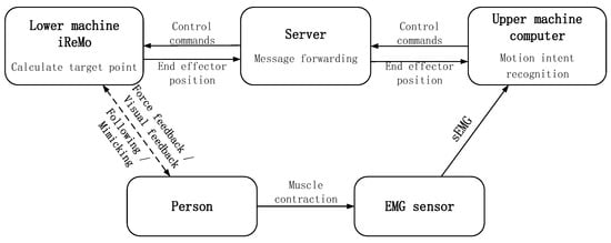 The system comprises the iReMo® lower computer, a server, a host computer, and sEMG sensors, as illustrated in Figure 23. When the user performs active movements, muscle contractions generate EMG signals, which are captured by the sensors and sent to the host computer. The host computer uses the MLCNN model to classify these signals and determine the user’s movement intention. It then generates control commands for the iReMo® end effector to respond accordingly. Both the host computer and iReMo® are connected to the same local area network, using the server for message forwarding to ensure real-time synchronization of commands and status information.
