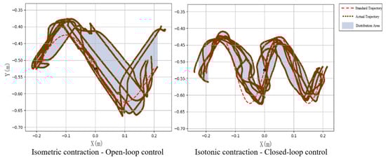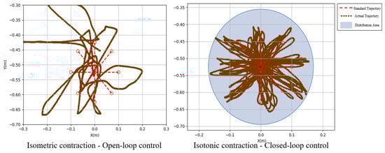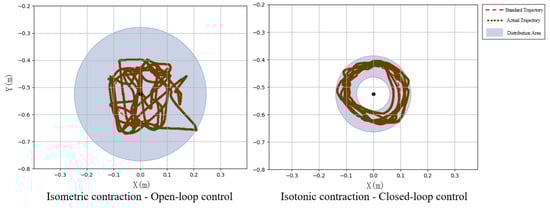 Subject 2 performed seven experiments on isotonic and isometric contractions, as shown in Figure 29. The red dashed line indicates the standard circular path, while the brown lines depict the experimental trajectories. Under open-loop control, trajectories were irregular and scattered (inner radius: 0.0045 m, outer radius: 0.2460 m). In contrast, closed-loop control yielded more circular and concentrated trajectories (inner radius: 0.0618 m, outer radius: 0.1384 m), demonstrating improved alignment with the standard path.