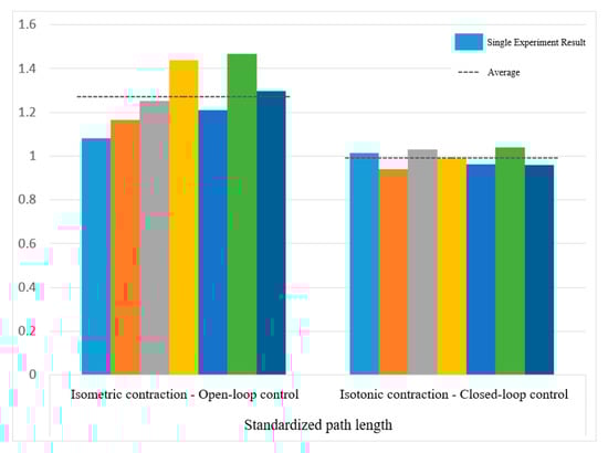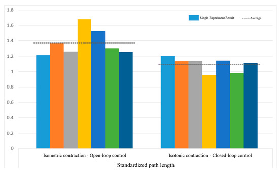 Standardized path length of sinusoidal path in open-loop and closed-loop control.