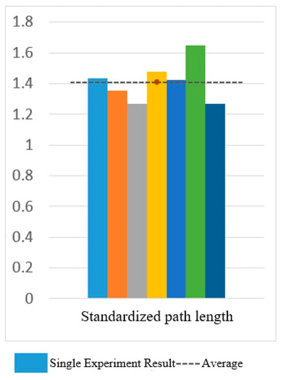 Figure 38 and Figure 39 show that open-loop control has an average smoothness of 0.48 and a range deviation of 0.32, while closed-loop control averages 0.54 in smoothness and 0.19 in deviation. Thus, motion smoothness is similar, but open-loop control better handles range deviation. Figure 40 presents standardized path length, with open-loop averaging 1.27 and closed-loop at 0.99. Open-loop control exceeds the target length with mostly straight paths, while closed-loop control takes a shorter, more direct route, indicating better trajectory control.