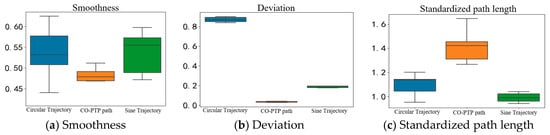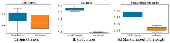 In the closed-loop control experiments, box plots in Figure 42 analyze smoothness, range deviation, and standardized path length for three paths. Motion smoothness centers around 0.5 for all trajectories, indicating a maximum speed approximately twice the average speed. For range deviation, values from 0 to 1 show that higher values indicate smaller deviations from expected trajectories, with the ranking as follows: CO-PTP path > Sine Path 1 > circular path. The CO-PTP path requires the highest control capability due to its straight segments, while the sine trajectory shows lower accuracy at trough positions.
