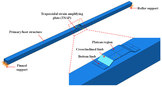 In this section, numerical investigations are covered to ascertain the strain amplification for given external loads by adopting the proposed TSAH. Basic numerical investigations were carried out in the finite element (FE) software, ABAQUS®, Version 6.14 [55] under the action of static load, to circumvent the limitations of the previously proposed curved-type energy harvester of Ref. [54], which cannot be instrumented on steel structures. The schematic diagram of the host structure and the trapezoid strain-amplifying plate (TSAP) is shown in Figure 1 and Table 1. It should be noted that sensors were not modeled in the numerical study as it is mainly focused on the effect of the geometric properties of the TSAP for strain amplification. All the dimensions mentioned in Table 1 are in mm. The dimensions of the TSAH were chosen to be the smallest possible such that it can accommodate different types of sensors such as MFC and PZT, which were considered for the investigations by not altering the physical properties of the primary structure such as mass and stiffness.