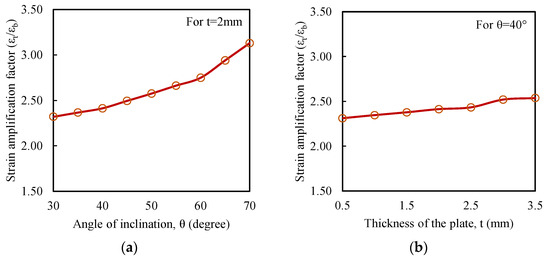 Initially, the longitudinal beam and TSAP were modeled as separate parts in ABAQUS® and later assembled ensuring a rigid connection for proper load transfer between the two parts. The longitudinal hollow square beam of length 3000 mm was modeled using 3D solid elements. The cross-section of the beam was first modeled in the XY-plane and then extruded in the Z-direction using the solid extrusion option available in ABAQUS®. Similarly, the longitudinal section was modeled first in the YZ-plane, and the solid extrusion was performed in the X-direction for the TSAP. The left edge of the host structure was restrained for translations in the X-, Y-, and Z-directions to simulate the pinned support, whereas the right edge was restrained for translations in the X- and Y-directions to simulate the roller support as shown in Figure 1. A uniformly distributed load of 1 N/mm2 was applied on the top surface in the XZ-plane in the negative Y-direction. The mesh size of finite elements was kept at 0.5 mm and the elements were modeled as a C3D8R, 8-node linear brick element for both the host and TSAP. Reduced integration with hourglass control was ensured for both entities. Initially, the angle of inclination (θ) of the cross limb in the TSAP was considered as 30° and the thickness of TSAP as 2 mm, as shown in Table 1. The strain amplification factor was arrived at by attaining the ratio of the strains on the plateau region (εt) of the secondary structure to that on the host structure at a location below the TSAP (εb) (see Table 1). Depending on the angle of inclination, the height h of the trapezoid plate was calculated by applying the tan rule as per the dimensions mentioned in Table 1. To ensure proper transfer of the loads from one entity to the other, the TSAP was bolted to the beam. The performance of the beam and TSAP assembly subjected to uniform pressure is interpreted in terms of the strain amplification factor (εt/εb). The finite element analyses were carried out by varying θ from 30° to 70° to determine the effect of the same on the strain amplification factor for a 2 mm thick plate. The variation in the strain amplification factor with the angle of inclination at an interval of 5° is presented in Figure 2a. The strain amplification factor was found to increase, on average, by 3.83% for every 5° increase in the angle θ. It is observed that the strain was amplified by 2.32 (min.) to 3.131 (max.) times when the angle of inclination was varied from 30° to 70°.