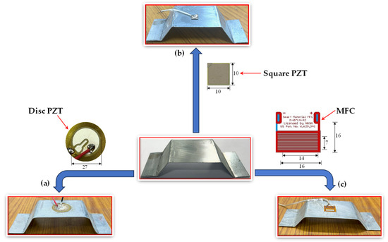 A rectangular mild steel plate of dimensions 162.5 × 50 × 0.5 mm was cut from a large plate using a cutting machine. As per the numerical study, the strain amplification factor increased marginally with the increase in the thickness; therefore, for the current experimental study, a 0.5 mm thick mild steel plate was selected considering the ease of bending. With the help of the bending machine, the cross limbs of the trapezoid were bent to achieve a moderate inclination of 40° with the horizontal. Since it is known from numerical studies that the amplification increases with an increase in angle, the angle of inclination was kept moderate for the experimental investigations. For the current research, four such specimens were fabricated to carry out both field and laboratory experiments; two were used for the laboratory experiments, and the other two for the field investigations. To conduct laboratory investigations, one TSAH named TSAH-DISC was bonded with a circular disc PZT patch (27 mm diameter and 10 mm width), manufactured by PRIELSYS [57]. The other, named TSAH-MFC, was bonded with macro-fiber composite (MFC), manufactured by Smart Materials Corporation [58], as shown in Figure 3. For the current study, MFC with the d31 variant labeled M-0714-P2 with dimensions (Figure 3c) was used with a thickness of 300 µm. For field investigations, one TSAH was bonded with a circular disc PZT patch, i.e., TSAH-DISC, and the other with a square PZT patch (10 × 10 × 0.3 mm) of grade PIC 151, manufactured by PI Ceramic [59], named TSAH-SQR.