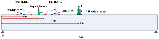 Schematic diagram of the host structure showing locations of PZT-based harvesters cum sensors and excitation points (all the dimensions mentioned are in cm).