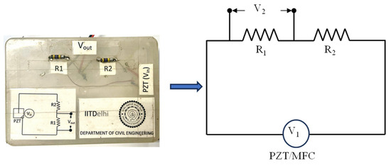 The load resistors, R1 and R2, of the circuit, as shown in Figure 6, were chosen based on the impedance matching technique. Hence the output voltage (V2) across the resistor, R1, was measured using a digital multimeter of high resolution to accurately determine the current flowing through the circuit and the power developed due to the excitations. The voltage generated across the transducer when the structure was subjected to excitations was fed as the input voltage (V1) to the circuit. The output voltage (V2) was measured across the resistor, R1. From the output voltage (V2), the current (i) and the power were calculated using