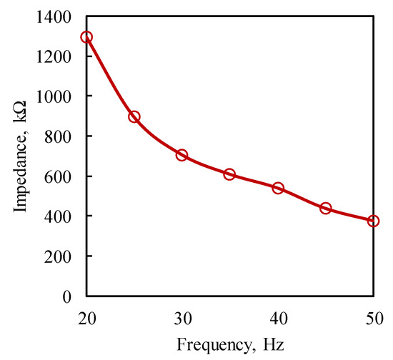 It was observed that the impedance decreases as the frequency of vibration increases (see Figure 7). From the graph plotted, the interpolated value of the impedance at the excitation frequency of 24 Hz was determined as 974.594 kΩ, as the shaker induces vibration at this particular frequency.