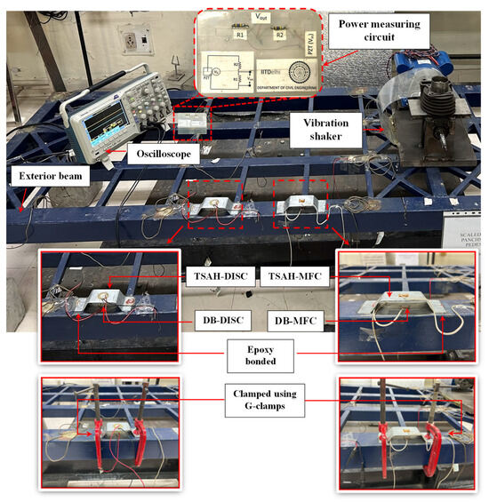 All the PZT-based harvesters cum sensors considered in this study were bonded on the exterior longitudinal beams of the prototype bridge structure, as shown in Figure 8. The longitudinal beam of the lab-sized steel foot over-bridges, which is 3 m long (c/c), acts as a host structure. It was instrumented with TSAH and directly bonded (DB) PZT transducers to evaluate the relative energy harvesting potential of the proposed strain amplification approach. The experiments were conducted to determine the open circuit voltage of all four PZT-based transducers. The measurement was made using a TDS 2004B oscilloscope [62]. Further, the power generated across the PZT-based harvesters cum sensors was measured by connecting an auxiliary impedance-matched circuit, known as a power measuring circuit (see Figure 6).