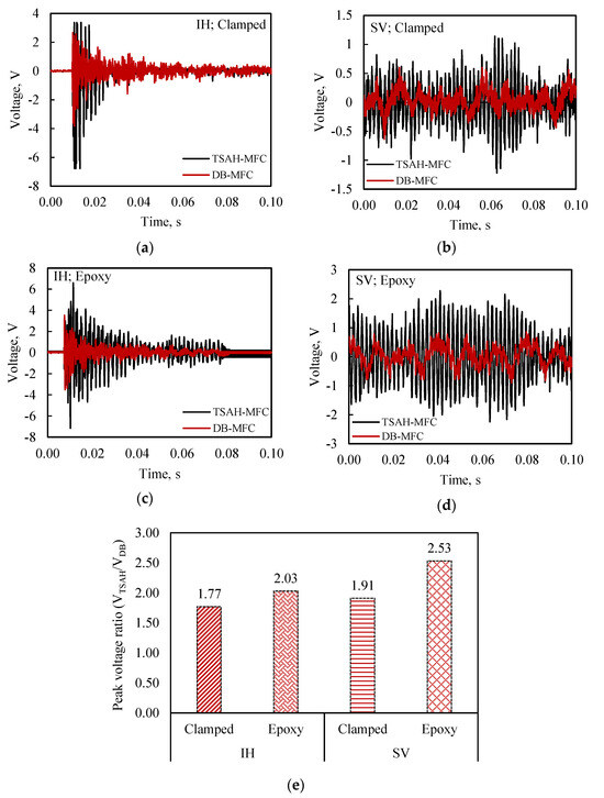 The open circuit voltage of the TSAH-MFC and the DB-MFC was measured when the host structure was subjected to IH and SV excitations under clamp connection criteria using an oscilloscope. The voltage responses of the TSAH-MFC and the DB-MFC are shown in Figure 9a and Figure 9b for IH and SV vibrations, respectively. The experiments were repeated by removing the G-clamps and bonding the TSAH-MFC to the host structure using a two-part epoxy adhesive. Figure 9c and Figure 9d depict the voltage response when the TSAH-MFC was adhesively bonded to the host structure. The plotted graphs show that in every case, a greater voltage response across the TSAH was obtained compared to the directly bonded MFC patches. In the current study, the peak voltage ratio (VTSAH-MFC/VDB-MFC) was a metric used to quantify strain amplification.