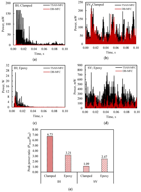 Comparison of power generated between DB-MFC and TSAH-MFC, with the host structure subjected to (a) impact hammer (IH) vibrations (clamped) and (b) shaker (SV) vibrations (clamped); (c) impact hammer (IH) vibrations (adhesively bonded) and (d) shaker (SV) vibrations (adhesively bonded); (e) peak power ratio (PTSAH-MFC/PDB-MFC) for all four conditions.