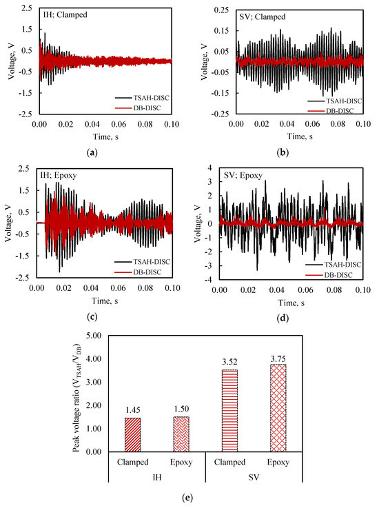 The voltage response of the TSAH-DISC and the DB-DISC under IH and SV excitations in the clamped condition is shown in Figure 11a and Figure 11b, respectively. Figure 11c and Figure 11d depict the voltage response when the TSAH-DISC was adhesively bonded to the host structure and of the DB-DISC, under IH and SV excitations, respectively.