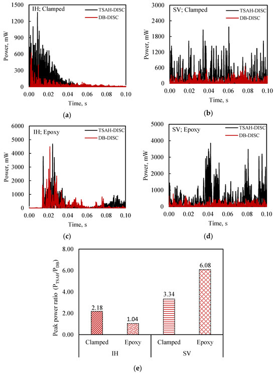 Comparison of power generated between TSAH-DISC and DB-DISC, with the host structure subjected to (a) impact hammer (IH) vibrations (clamped) and (b) shaker (SV) vibrations (clamped); (c) impact hammer (IH) vibrations (adhesively bonded) and (d) shaker (SV) vibrations (adhesively bonded); (e) peak power ratio (PTSAH-DISC/PDB-DISC) for all four conditions.