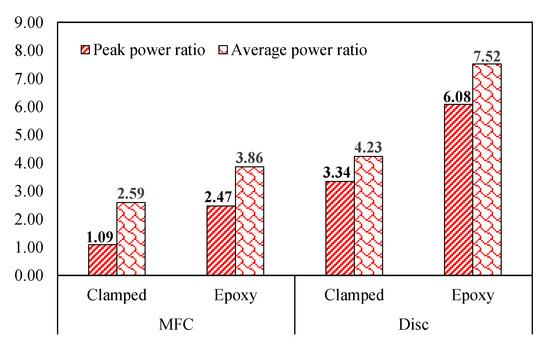 - When the TSAH-MFC was clamped, the peak power ratio was 1.09 for SV vibrations, whereas when it was adhesively bonded, the peak power ratio increased to 2.47, which shows the better transfer of the strains in the latter case.