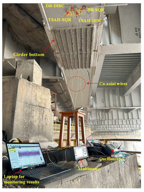 For field deployment, the soldered patches were made weather-resistant by coating them sufficiently with epoxy adhesive to protect them from the harsh environment in the field. One each of the TSAH-DISC and TSAH-SQR were fabricated at the laboratory, as shown in Figure 15a for field application. The bottom surface of the main girder of the ROB was made smooth by rubbing it with sandpaper, then the marking was conducted to ensure that all of them lay in one single line. Further, all the sensors were bonded to the bottom face of the longitudinal main girder of the ROB steel bridge using epoxy adhesive. To prevent the sensors from falling off the girder due to self-weight and vibrations caused by traffic, large magnets were used to hold them in place for 24 h, as shown in Figure 15b.