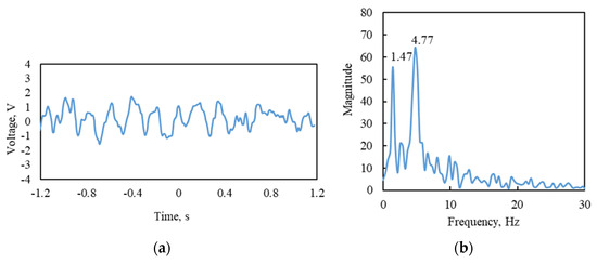 After ascertaining the proper bonding of the sensors to the bottom of the girder, the voltage and power measuring experiments were carried out under traffic to acquire the required data. The details of the experimental setup are shown in Figure 16. Time domain signals of the TSAH-PZT were acquired when the bridge was vibrating under traffic excitations, as shown in Figure 17a. The frequency domain of the voltage values that were transformed using the Fast Fourier Transform (FFT) function is shown in Figure 17b.