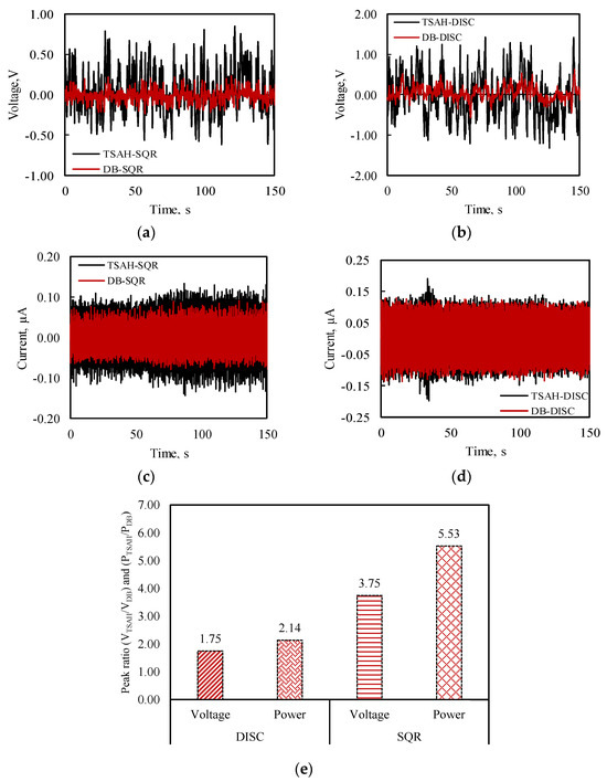 Comparison of (a) open circuit voltage generated with time (TSAH-SQR vs. DB-SQR), (b) open circuit voltage generated with time (TSAH-DISC vs. DB-DISC), (c) current generated with time (TSAH-SQR vs. DB-SQR), (d) current generated with time (TSAH-SQR vs. DB-SQR) and (e) peak ratios of voltage and power in case of square and disc PZTs for traffic-induced vibrations.