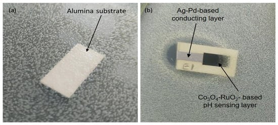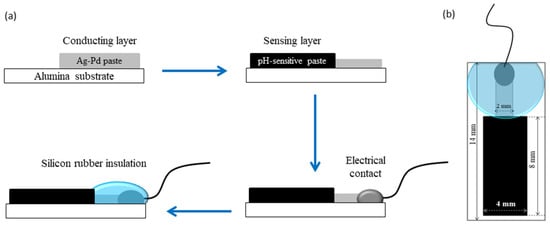 For the fabrication of the pH-sensitive electrodes, firstly a conducting layer of the Ag/Pd paste (9695, Electro-Science Laboratories, King of Prussia, PA, USA) was screen-printed on an Al2O3 (96%) substrate. The conducting layer was allowed to dry for 15 min at 120 °C in a dryer before being fired at 860 °C for 15 min. After firing of the conductive layer, the paste based on Co3O4-RuO2 was screen-printed at one end of the conductive layer, dried at 120 °C for 15 min and sintered at 900 °C for one hour. For comparison, pastes based on three pure cobalt oxides—CoO, Co3O4, and Co2O3—were prepared and used for fabrication of pH sensors following the same fabrication procedure used for the electrodes based on Co3O4 and RuO2. After sintering of the sensitive layer, a copper wire was soldered at the other end of the conducting Ag/Pd layer. This electrical contact between the wire and the layer was insulated using a non-corrosive polydimethylsiloxane (DOWSILTM 3140 RTV coating, Midland, TX, USA) coating while the sensitive area of the electrode was left uncovered. The schematic representation of the steps involved in the fabrication of the pH-sensing electrode and its dimensions are shown in Figure 1.