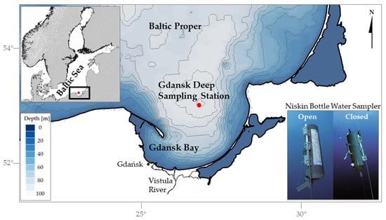 The location of the sampling station and the sampling method employed in the study (after General Oceanics Inc.). The upper left corner contains an inset showing a broader map of the region for geographic context. The central section of the figure highlights the study area, zooming in on the Gdańsk Deep sampling station. The lower right corner illustrates the Niskin Bottle Water Sampler in two positions: open and closed.