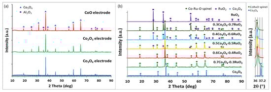 X-ray diffractograms of screen-printed layers of the various cobalt oxides (a) and the various compositions based on Co3O4 and RuO2 in different molar proportions (b).