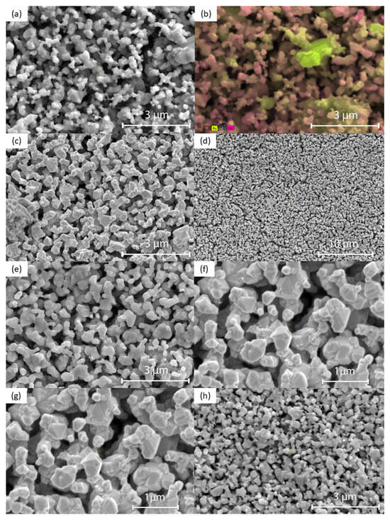 SEM images of the surface of Co3O4-RuO2 thick-film electrodes with different Co3O4 contents: (a) 30 mol% Co3O4 (50,000×, 10 kV); (b) 30 mol% Co3O4 (50,000×, 15 kV; SEM with EDS analysis to show Co and Ru distribution with the yellow regions corresponding to RuO2 grains); (c) 40 mol% Co3O4 (50,000×, 3 kV); (d) 40 mol% Co3O4 (12,000×, 10 kV); (e) 50 mol% Co3O4 (50,000×, 10 kV); (f) 50 mol% Co3O4 (100,000×, 3 kV); (g) 60 mol% Co3O4 (50,000×, 10 kV); (h) 70 mol% Co3O4 (50,000×, 10 kV).