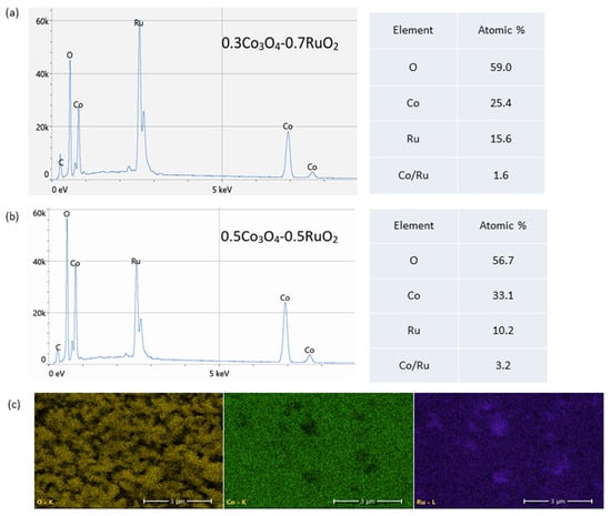 Results of EDS analysis: (a) EDS spectra and elemental composition of 0.3Co3O4-0.7RuO2; (b) EDS spectra and elemental composition of 0.5Co3O4-0.5RuO2; (c) EDS maps of O (yellow), Co (green), and Ru (purple) for 0.5Co3O4-0.5RuO2.