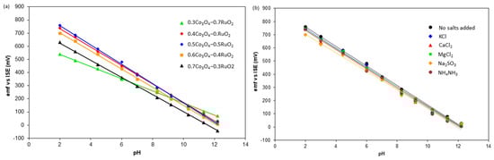 The pH sensitivity of the fabricated electrodes was also investigated in 0.01 M solutions of water mixed with KCl, CaCl2, MgCl2, Na2SO3, and NH4NO3. All the fabricated electrodes continued to exhibit super-Nernstian sensitivity in the presence of the aforementioned salts, as illustrated in Figure 6b. The pH sensitivity of the 50 mol% Co3O4-50mol% RuO2 electrode without the presence of any added salts was 73.8 mV/pH. In the presence of 0.01M of KCl, CaCl2, MgCl2, Na2SO3, and NH4NO3, the pH sensitivity in the range of 2–12 was 73.4 mV/pH, 73.1 mV/pH, 71.9 mV/pH, 69.8 mV/pH, and 73.8 mV/pH, respectively. Therefore, we observed small advantageous changes in comparison to the pH sensitivity exhibited by the pH electrodes in the absence of any additional ions, which reflects good selectivity of the fabricated electrodes. A similar result was observed for pure RuO2-based pH electrodes [6] in the presence of KCl and NH4NO3, which indicates that the incorporation of Co3O4 in the pH-sensing layer does not significantly impact the selectivity of the final screen-printed layer. The presence of the ions investigated in this work also had no significant influence on the selectivity of La2O3-RuO2-based pH-sensing electrodes [13]. The largest influence of the interference effect was observed in the presence of Na2SO3, whereas the least influence was related to NH4NO3. On the other hand, the highest influence on pH sensitivity was observed in the presence of NH4NO3 in a screen-printed layer based on 50 mol% CuO-50 mol% RuO2 and covered with a proton-selective Nafion membrane [14].