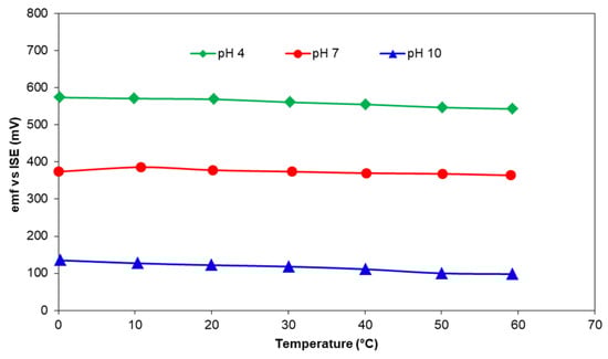 However, electrochemical properties alone do not determine the quality of a sensor. A screen-printed sensing layer must also be durable and able to withstand harsh physical conditions such as turbulent flow and the presence of large particles in the water. Unlike the nominal and acceptable differences in the potentiometric performance, there is a significant difference between various compositions in terms of their adhesion to the alumina substrate which subsequently impacts a very important feature of the sensor—long-term stability. Under the conditions of synthesis, printing, and sintering of pH-sensing layer, used in this study, the composition in Table 2 that had the best adhesion to the substrates and sustained repeated measurements without peeling off or being washed away was 50 mol% Co3O4-50 mol% RuO2. The sensing layer was able to withstand repeated experiments and storage in dry ambient conditions over a period of 6 months while exhibiting near-Nernstian sensitivity with a good correlation coefficient. When the temperature of the buffers at pH of 4, 7, and 10 was raised from 0 to 60 °C, there was a slight change in the emf due to the increased dissociation process which followed the Nernst theory (Equation (1)) and led to higher participation of OH− and H+ ions in the electrochemical reactions. The emf of the sensing layer based on 50 mol% Co3O4-50 mol% RuO2 adapted instantaneously to the rising heat from 0 to 60 °C (Figure 7) and validated the stability of the fabricated sensors in the presence of continuously varying temperature. A similar result was observed for pH electrodes based on Co2O3-RuO2 pH electrodes [16].