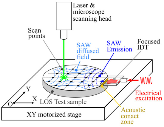 Schematic diagram of SAW introduction on an LOS sample using an offset IDT and SAW displacement recording with a laser vibrometer.