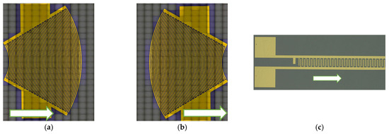 Next, a concave aperture IDT was tested to achieve divergence. This IDT has the same characteristics as the previous one (25 pairs of electrodes deposited on a Y128°-cut lithium niobate substrate), as shown in Figure 11a and Table 1. This convergent IDT was designed with electrodes in the shape of circular arcs sharing the same center of curvature. This design initially focuses on the SAWs at a focal point, after which the waves become divergent. The width at the inner edge of the IDT is 3.4 mm.