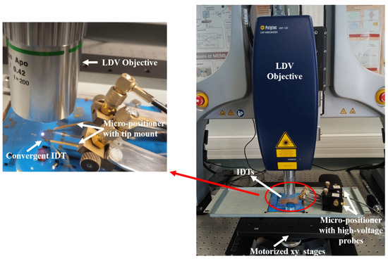 Displacement measurements to determine acoustic fields were performed on a platform called WAVESURF based on a laser Doppler vibrometer (LDV) (Figure 3) [26,27,28]. The LDV works on the principle of optical interference, measuring the phase shift in the reflected laser beam caused by displacement normal to the sample surface. Measurements are taken directly on the transducer to map the SAW acoustic field profiles. The transducers are excited using high-voltage probes connected to a micro-positioner for maintaining the probes.