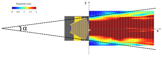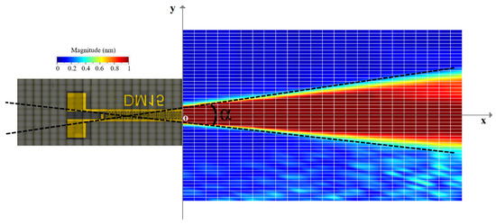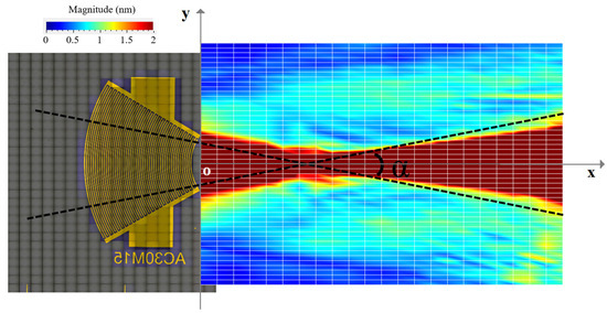 The displacement field obtained for the divergent IDT is shown in Figure 6. The displacements induced by the SAWs are of the order of 10 s of nanometers, and the acoustic beam diverges with an angle α around 15 degrees. The exact divergence angle at −3 dB and −10 dB will be presented in the discussion section. To better illustrate the divergence, color saturation was applied to displacement levels equal to or above 10% of the maximum displacement.